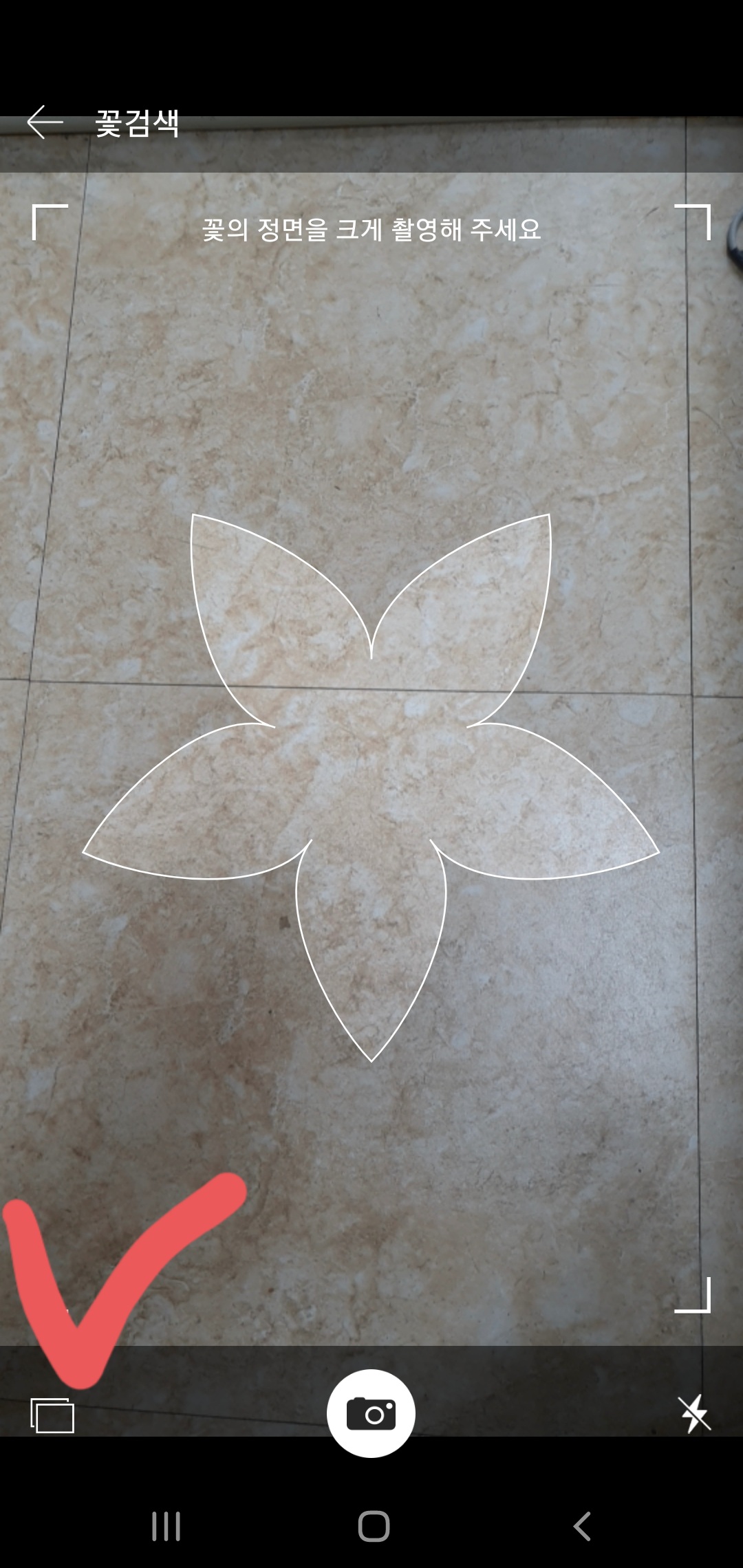 위 화면에서 "꽃검색" 클릭하면 [아래 사진]과 같이 "꽃의 정면을 크게 촬영해 주세요"는 화면이 나옵니다. 여기서 바로 사진 촬영해서 물어볼 수 있고 또 아래 사진 왼쪽에 표시된 아이콘을 눌러 갤러리에 있는 사진을 선택해서 물어볼 수 있습니다. 저는 후자로 갤러리에 있는 사진을 선택해서 물어보도록 하겠습니다.