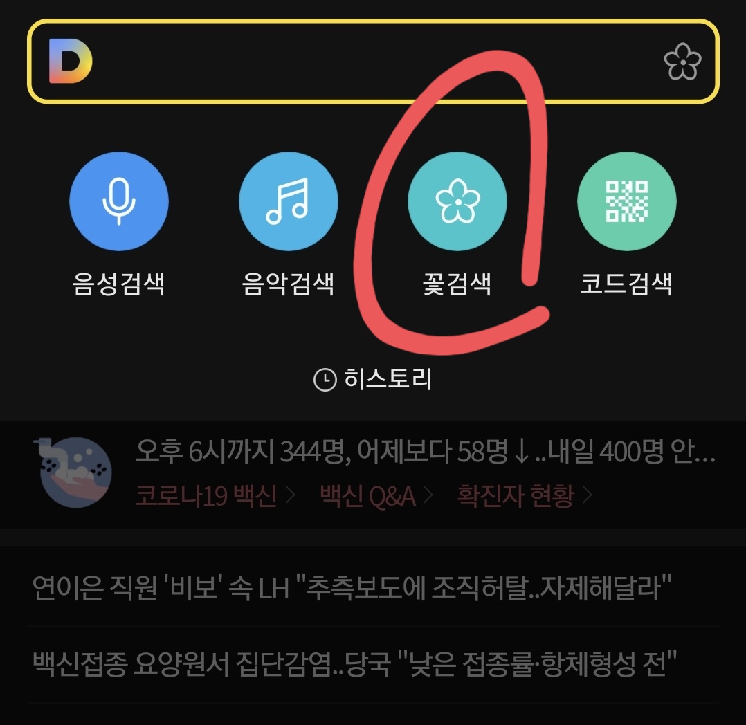 [아래 사진]은 "다음" 포털 어플 실행 화면입니다. 여기서 검색 키워드 입력할 수 있는 공간의 오른쪽 꽃 모양을 누르면 그 아래 표시된 "꽃 검색" 메뉴가 나타납니다. 그것을 눌러 꽃, 나무 등 식물이름 검색하시면 됩니다.