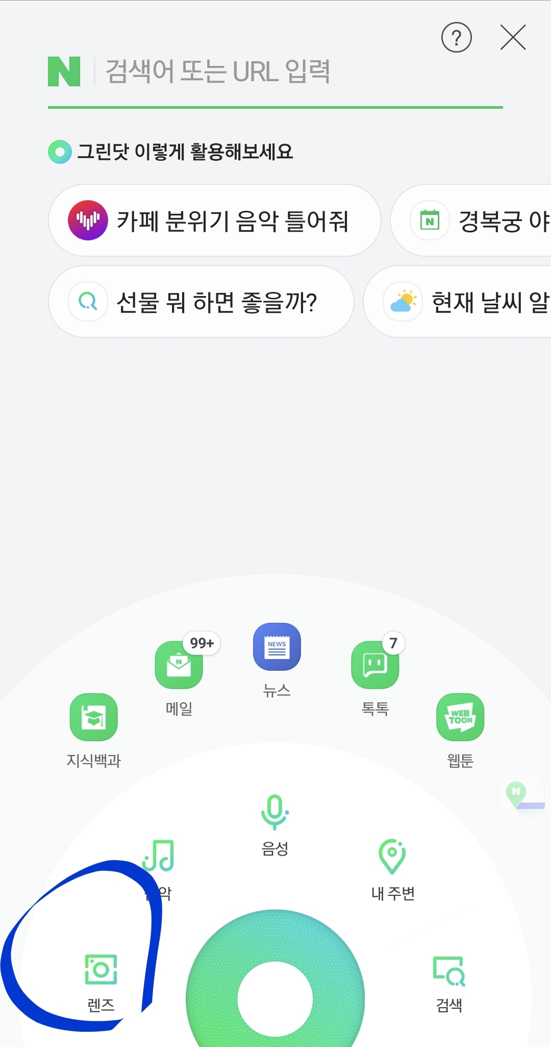 "네이버 스마트 렌즈"라는 별도 앱은 없지요. 네이버 어플 속에 포함된 하나의 기능이지요. 이거 사용 방법은 스마트폰에서 먼저 "네이버" 앱을 실행합니다. 그리고 하단에 녹색원으로 된 "그린닷" 아이콘을 누르면 [아래 사진]과 같이 "렌즈"가 나오는데 그것을 누르면 됩니다.