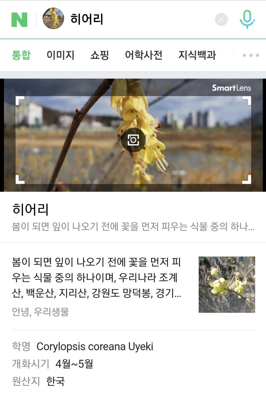 모르는 꽃사진을 업로드하고 1-2초 정도 기다리면 "꽃이름" 알려주는데 네이버 스마트 렌즈는 [아래 사진]과 같이 "히어리"라고 알려주네요. 그리고 "이 꽃은 봄이 되면 잎이 나오기 전에 꽃을 먼저 피우는 식물중의 하나"라는 부연 설명을 해줍니다. 나중에 나오는 잎모양은 "꽃이 피었을 때와 비교하면 전혀 다른 식물처럼 보인다."라고 하는데요. 나중에 잎이 나왔을 때 자세하게 관찰 한번 해봐야겠어요.