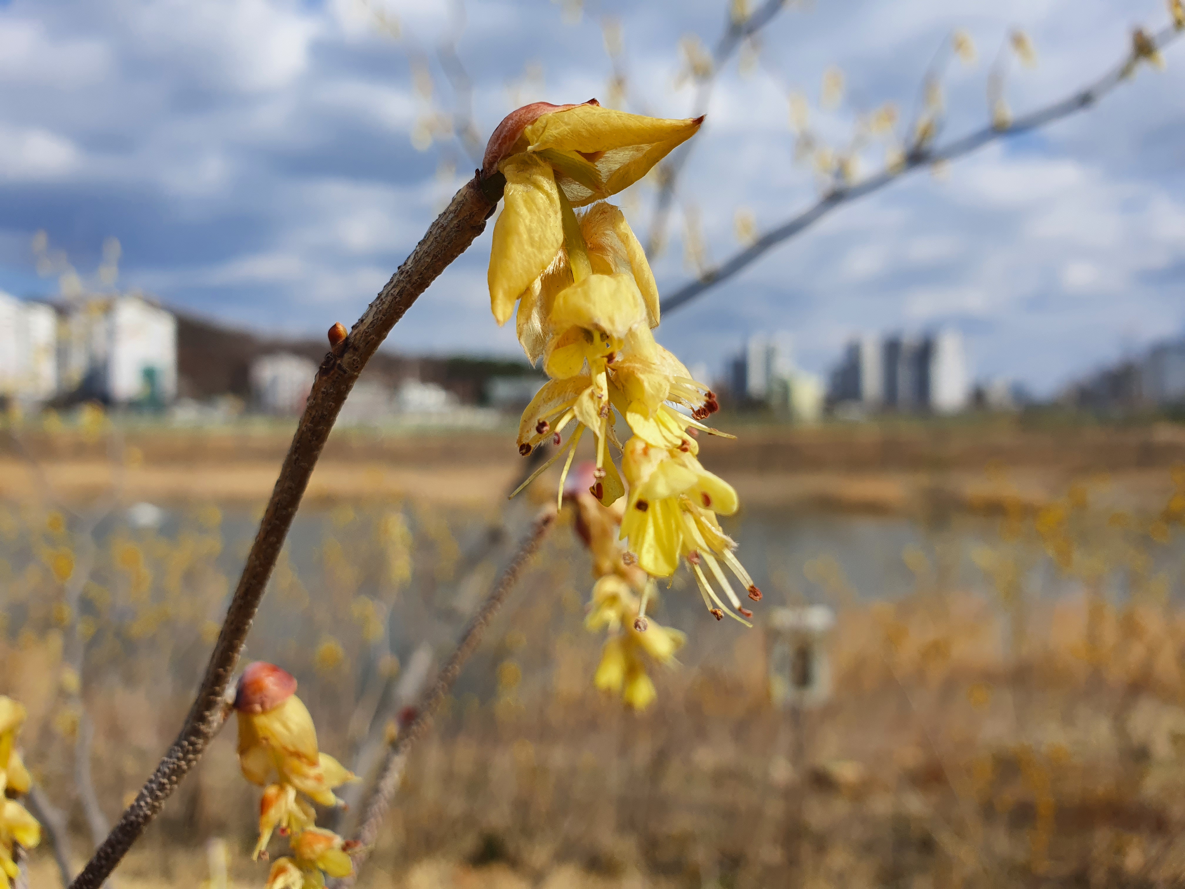 서울식물원 저류지 방향 산책로를 걷다 보면 이 꽃나무가 보여요. 혹자는 이 꽃 모양이 "산수유"하고도 비슷하게 생겼다고 하던데 자세히 보면 생김새가 많이 다르지요. 잎은 한 개도 없고 꽃만 있는 것으로 봐선 이 나무 또한 꽃이 지고 나면 잎이 피는 나무인 듯 보입니다.
