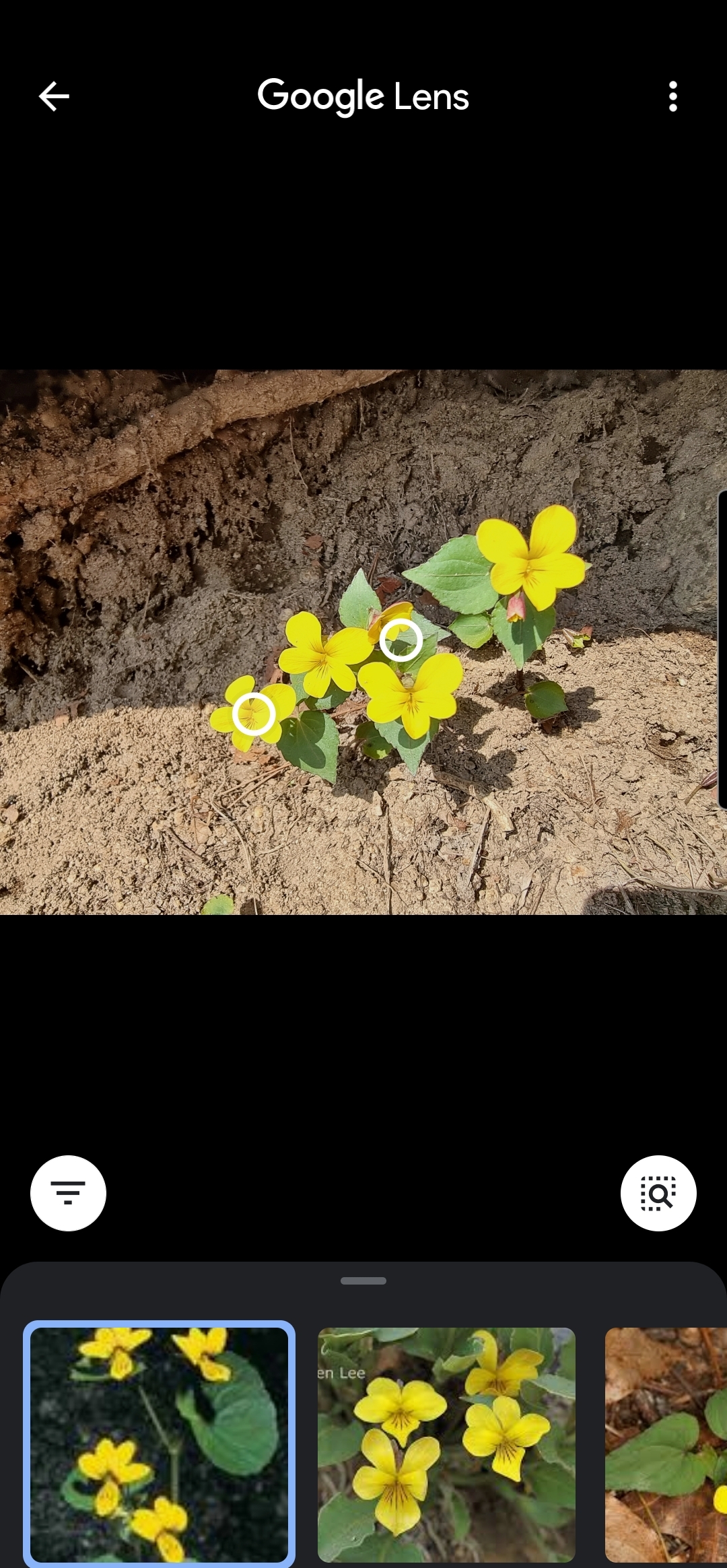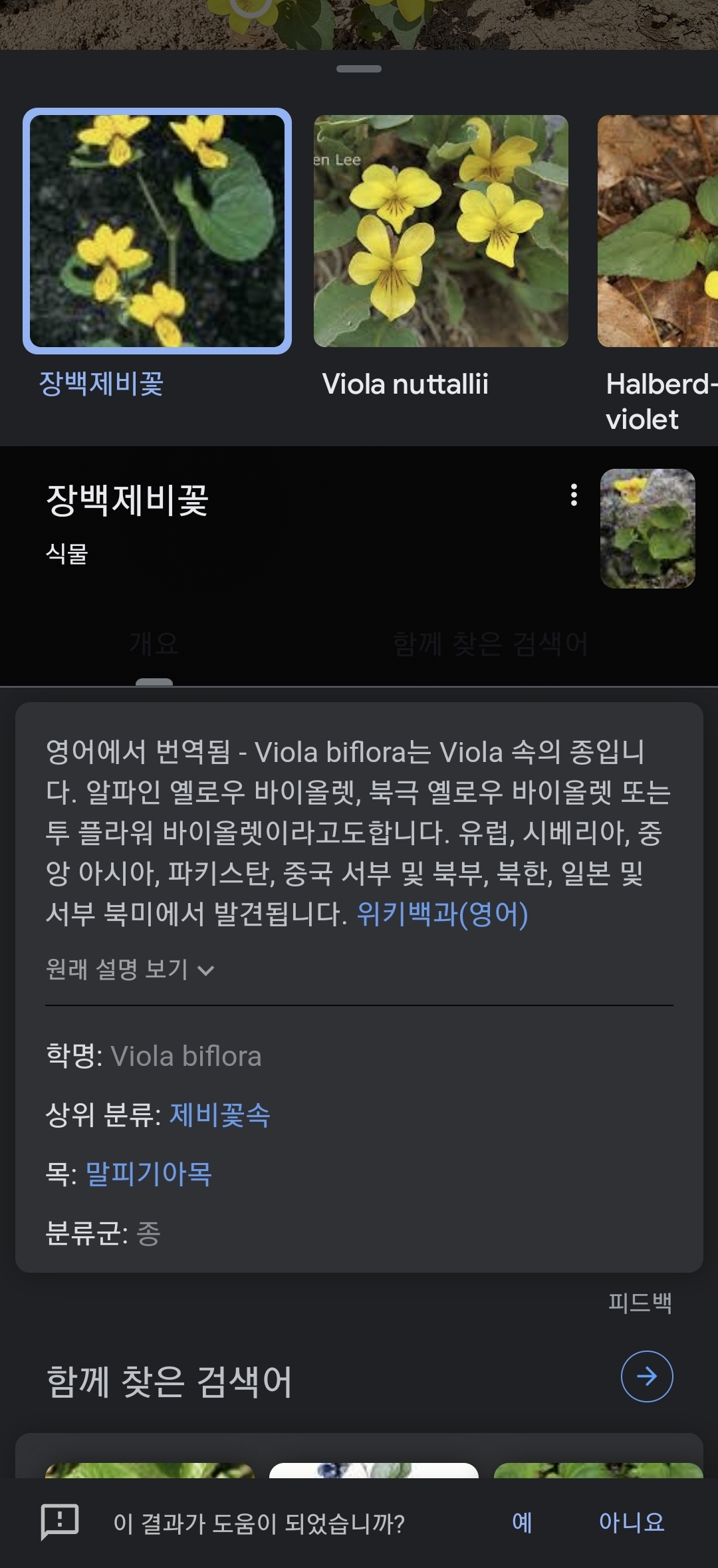 꽃 이름, 식물이름, 나무이름 알려주는 어플 구글 "렌즈"는 [아래 사진]과 같이 <장백 제비꽃>이라 알려줍니다.