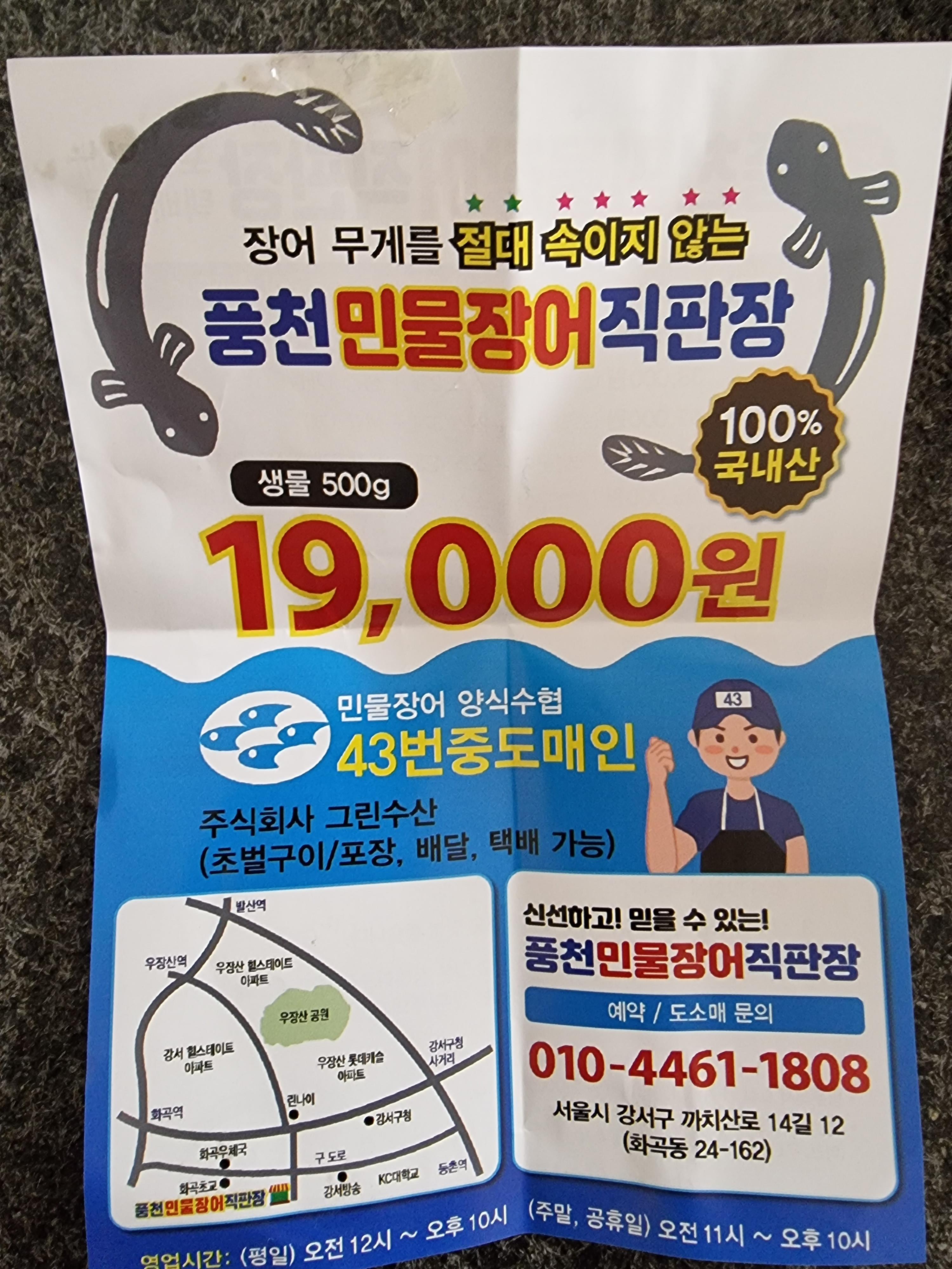전단지에는 장어 무게를 절대 속이지 않는 풍천 민물장어 직판장으로 100% 국내산입니다. 생물 500g 19,000원이라고 적시되어 있습니다. 믿어봐야 되겠지요?