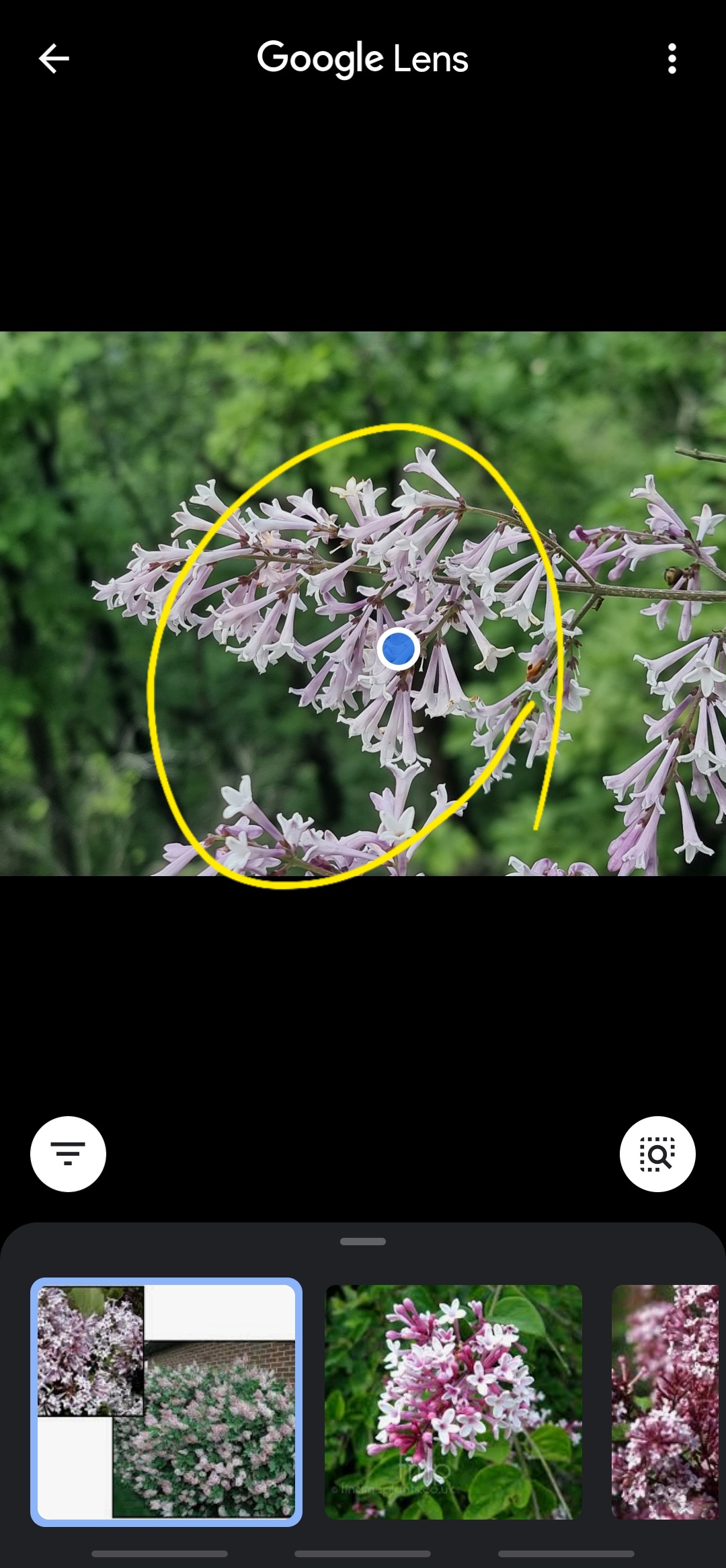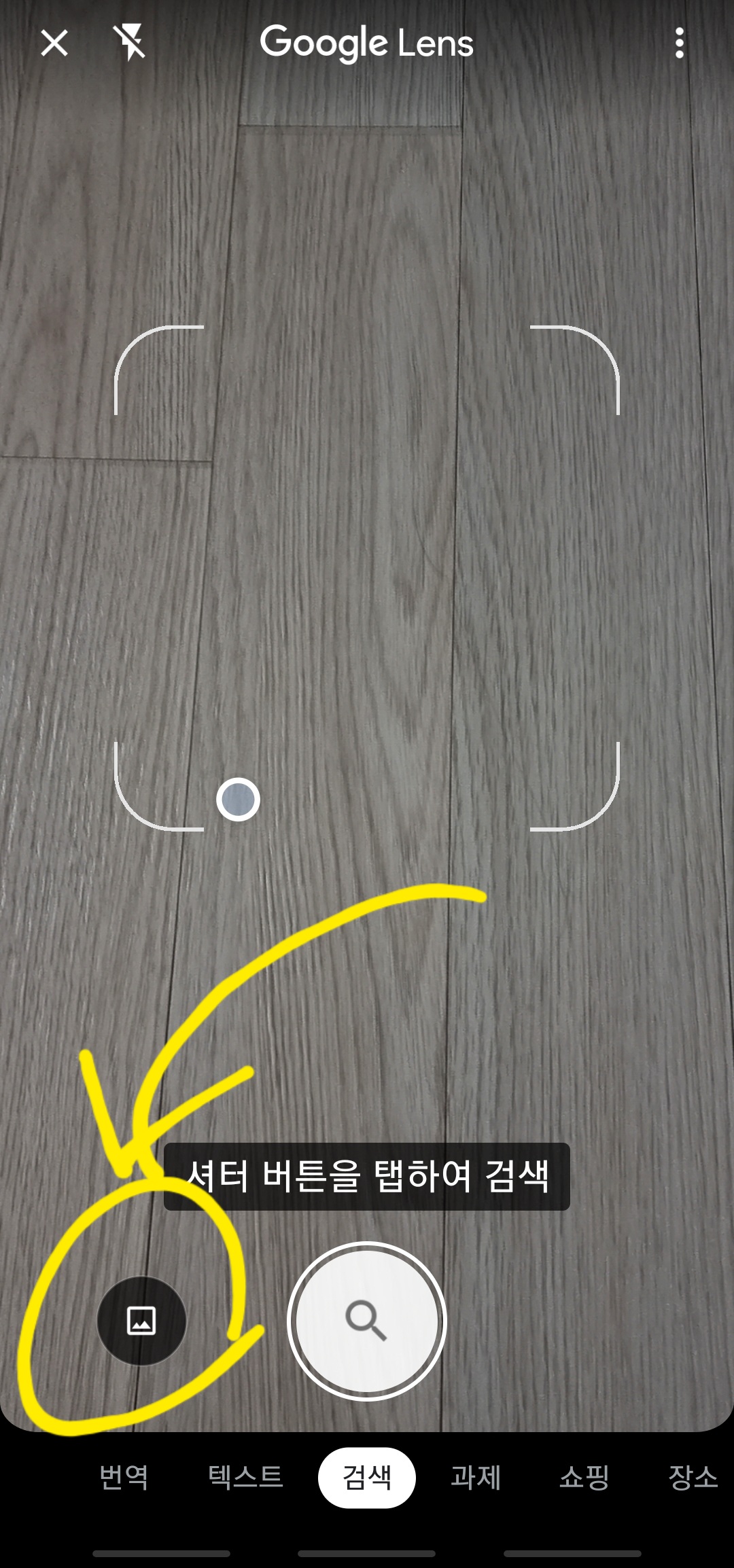 어플 "구글 렌즈" 실행하면 스마트폰은 [아래사진]과 같은 초기화면이 보입니다. 왼쪽 하단에 표시된 곳을 클릭해서 사진이 모여 있는 갤러리로 이동해 궁금한 꽃이름 사진을 클릭합니다.
