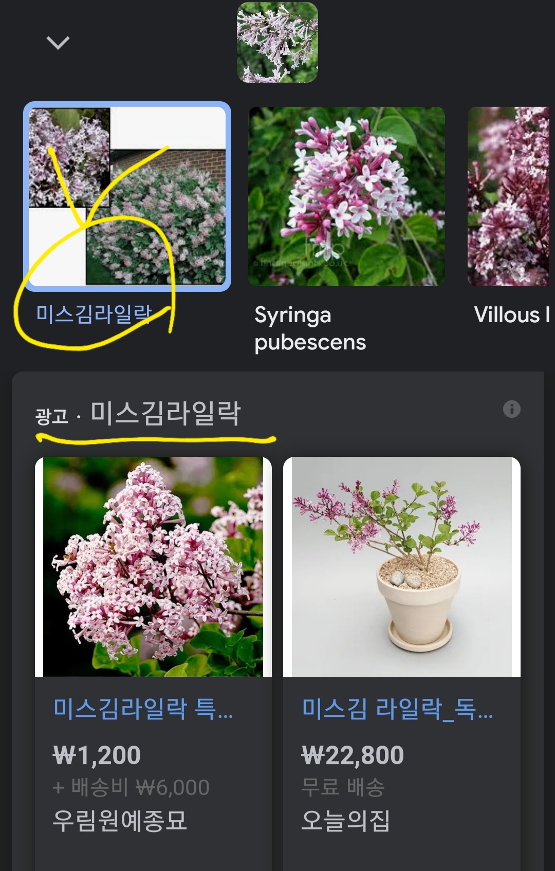 꽃이름 알려주는 어플 "구글 렌즈"는 [아래 사진]과 이 꽃이름을 "미스김 라일락"이라고 알려줍니다. 그런데요. 여기서 구글의 광고 배치가 아주 기막힙니다. 검색 결과 아래 "광고 미스김 라일락"이라고 보이세요. 절묘하게 배치했더군요.