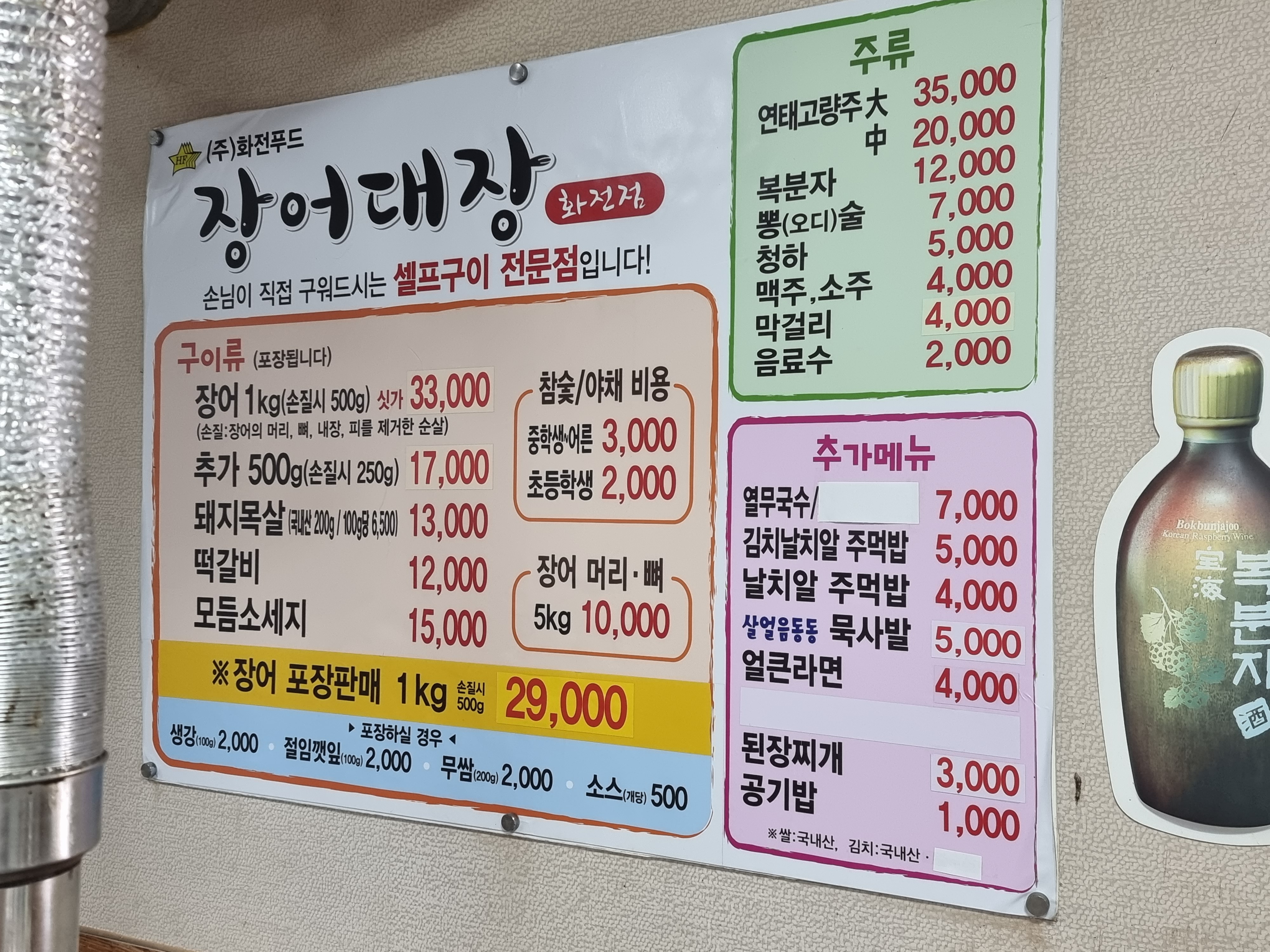 "이곳은 손님이 직접 구워 드시는 셀프구이 전문점입니다."라고 메뉴에 적시가 되어 있습니다. 메뉴 구성은 장어와 돼지 목살, 떡갈비, 모둠 소시지가 있으니 저는 오직 장어만 주문했습니다. 가격은 1kg에 3만 3천 원인데 이 무게는 장어 손질 시에는 500g 정도가 되네요. 장어의 머리, 뼈, 내장, 피 등이 반을 차지한다는 것을 이 식당에서 처음 알았습니다.