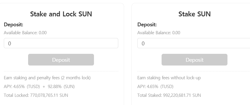 코인 거래소 코인원 원화마켓에 상장된 썬 코인은 위 설명에서 "토큰 보유자는 SUN 토큰을 스테이킹하여 플랫폼에서 발생한 수수료를 분배받을 수 있으며, 특정 기간 동안 SUN 토큰을 스테이 킹 및 락을 하면 페널티로 몰수된 SUN 토큰을 추가로 받을 수 있습니다."라고 하는데요. 이것을 할 수 있는 곳이 아래 링크입니다.