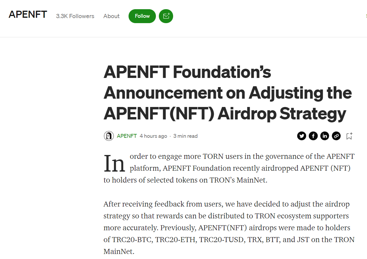 APENFT Foundation’s Announcement on Adjusting the APENFT(NFT) Airdrop Strategy