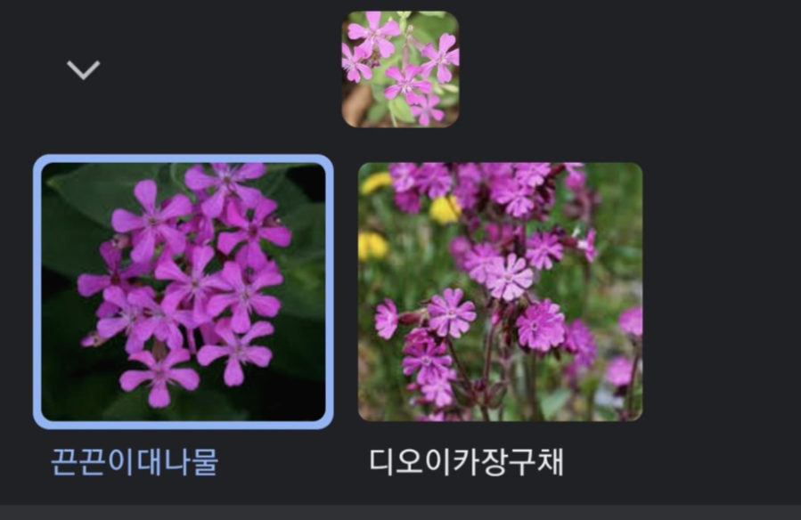 잠시 정말로 잠시 기다리면 결과가 [아래사진]과 같이 보여집니다. [아래사진]에서는 잘 보이지 않지만 이 어플은 이 꽃이름을 "끈끈이대나물"이라고 알려줍니다. 그리고 검색결과를 클릭하면 위키백과로 연결됩니다. 이곳에서는 이 꽃에 대해 "관상용으로 많이 심는다"라고 하면서 아래표와 같이 알려주네요.