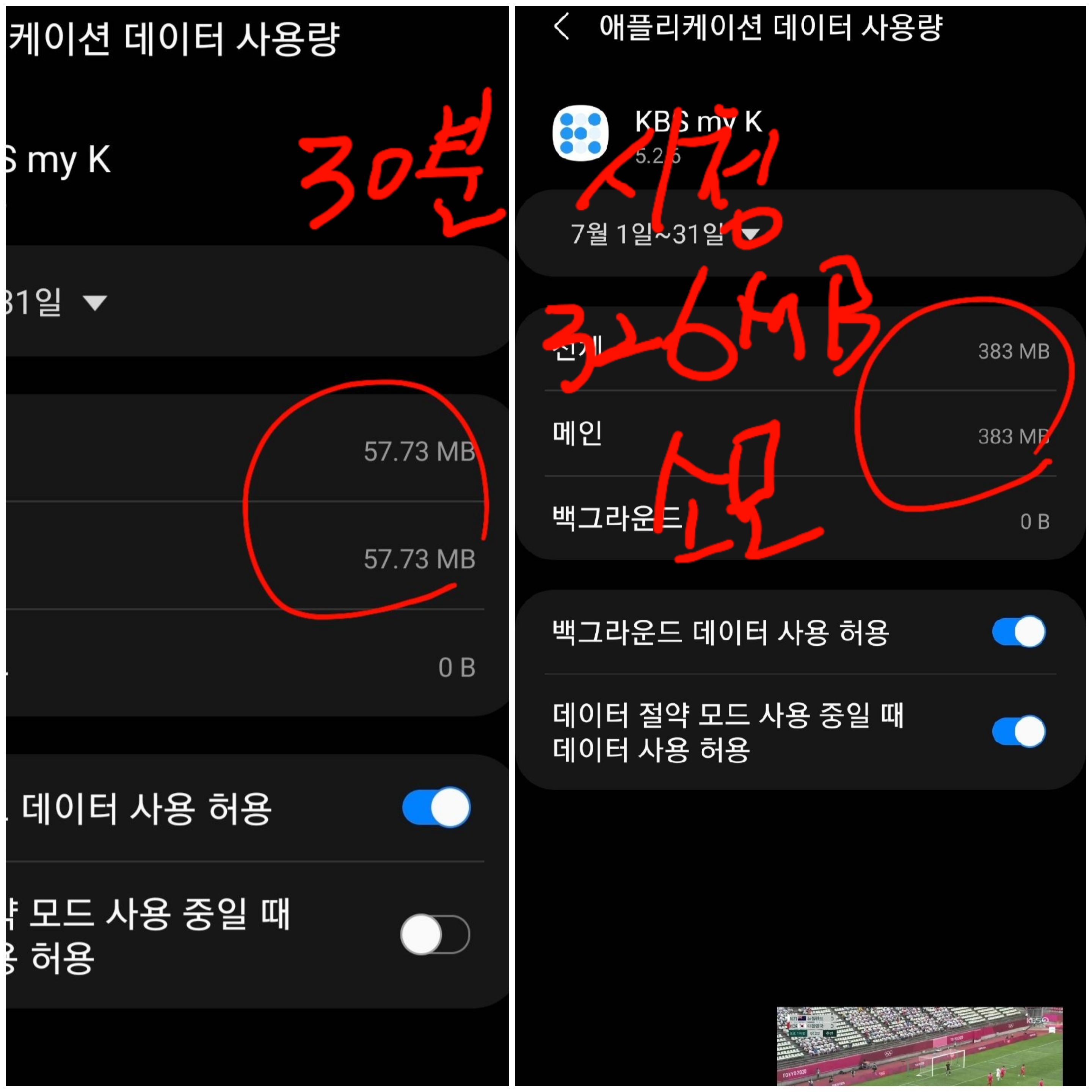계산해보니 30분 시청에 데이터 소모량은 약 326MB이네요. KBS MY K로 동영상 1시간 시청 시에는 652MB가 소모되고 2시간는 1.3GB가 됩니다. 그러니까 넉넉하게 축구 전후반 보면 이 정도 데이터가 소모되니 무제한 요금제가 아닌 이상 데이터 요금 폭탄에 쫄 수밖에 없지요.