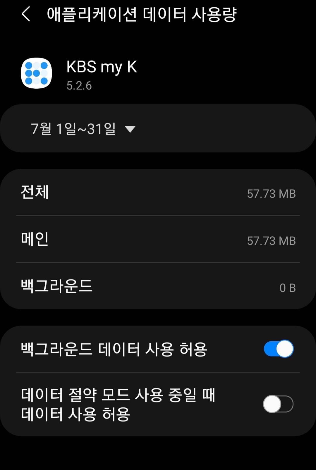 스마트폰의 애플리케이션 데이터 사용량 모드로 들어가서 내가 시청하고 있는 kbs my k 데이터 사용량을 [아래사진]과 같이 캡처했습니다. 캡처한 시간은 7월 22일 17시 46분입니다. 데이터는 57.73MB이네요.