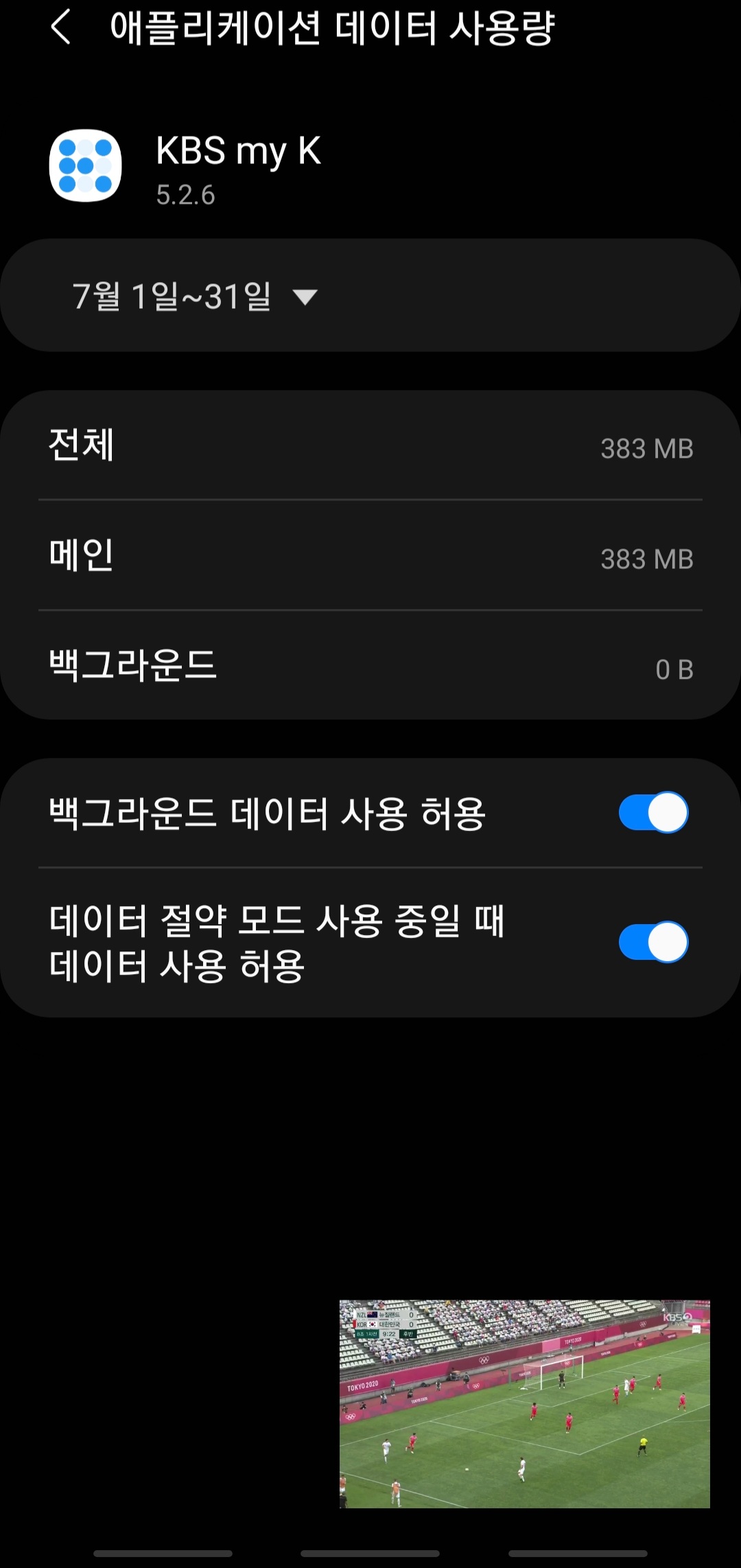 약 30여분 시청하고 kbs my k 앱을 종료했고 그 시간은 18시 15분입니다. 그리고 [아래사진]과 같이 애플리케이션 데이터 사용량 화면을 캡처했습니다. 데이터는 시작할 때 57.73이었는데 이것이 383MB로 변했네요. 이 숫자를 빼서 시간을 대입하면 데이터 소모량을 알 수 있을 것 같습니다.