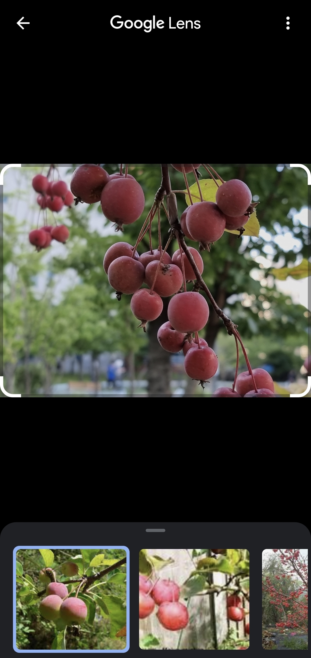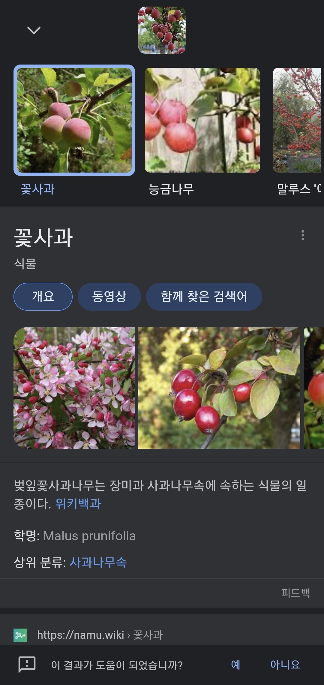 검색 결과 화면을 아래로 내리면 [아래 사진]과 같이 "꽃사과"라고 이 어플은 알려줍니다. 이 앙증맞게 생긴 열매 이름은 바로 꽃사과였네요. 그런데 이거 먹어도 되는 것인지 잘 모르겠네요.