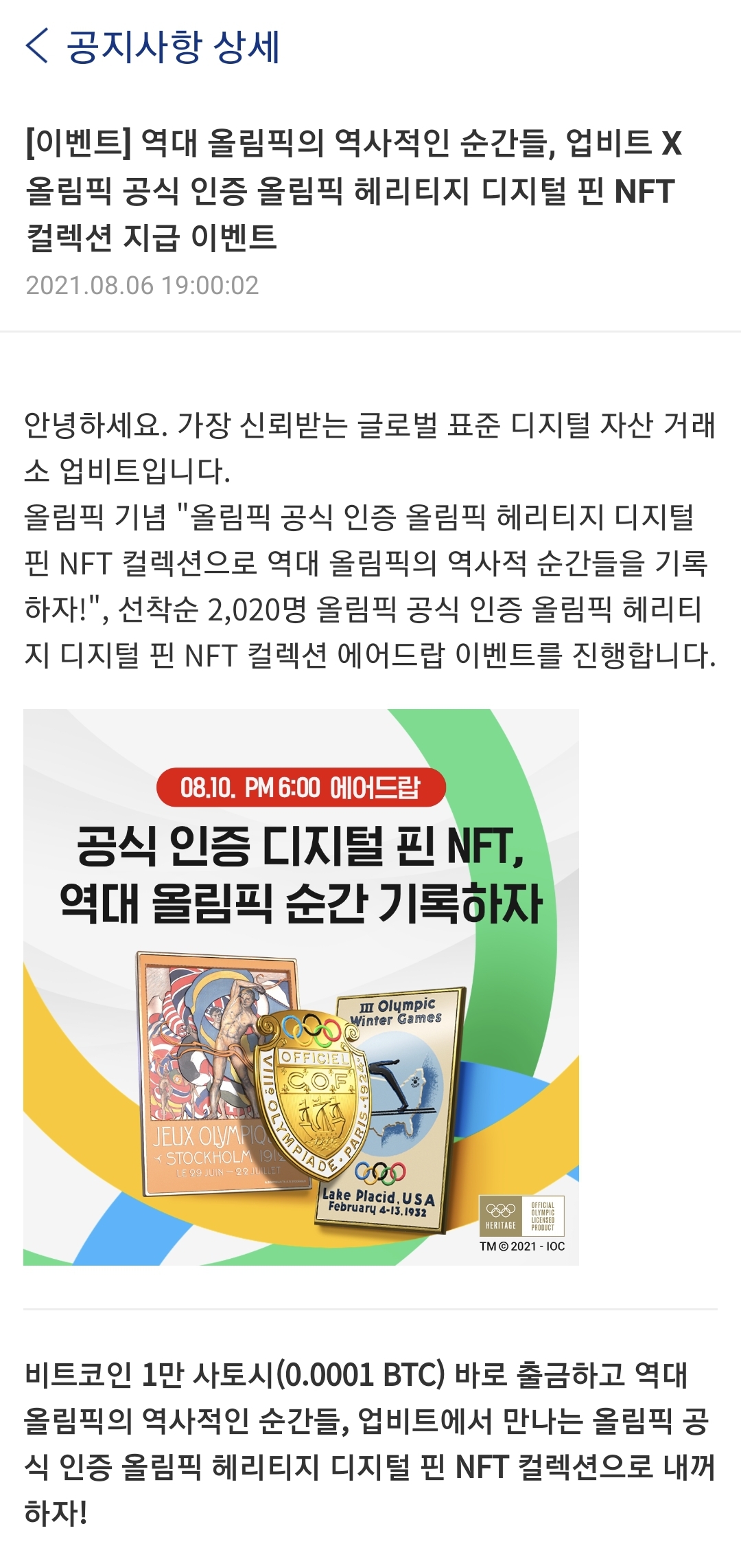 | 안녕하세요. 가장 신뢰받는 글로벌 표준 디지털 자산 거래소 업비트입니다. 올림픽 기념 "올림픽 공식 인증 올림픽 헤리티지 디지털 핀 NFT 컬렉션으로 역대 올림픽의 역사적 순간들을 기록하자!", 선착순 2,020명 올림픽 공식 인증 올림픽 헤리티지 디지털 핀 NFT 컬렉션 에어드랍 이벤트를 진행합니다. 비트코인 1만 사토시(0.0001 BTC) 바로 출금하고 역대 올림픽의 역사적인 순간들, 업비트에서 만나는 올림픽 공식 인증 올림픽 헤리티지 디지털 핀 NFT 컬렉션으로 내꺼하자! 비트코인 1만 사토시를 '바로 출금' 서비스를 통해 아래 지정된 입금 주소로 입금하시는 회원 2,020분께 선착순으로 올림픽 공식 인증 올림픽 헤리티지 디지털 핀 NFT를 랜덤으로 지급해드립니다. 회원님들의 많은 참여 부탁드립니다. *타 거래소 혹은 개인 지갑에 디지털 자산을 보유하신 회원님의 경우, 업비트 신규 가입 후 업비트 계정으로 디지털 자산을 입금하여 본 이벤트에 참여하실 수 있습니다. 자세한 내용은 '이벤트 참여 방법'을 참고해 주시기 바랍니다. [이벤트 대상자 선정 기준] - 아래 입금 주소로 업비트 "바로 출금" 기능을 이용하여 1만 사토시 (0.0001 BTC)를 입금한 회원 (선착순 2,020명) - 입금 주소 : btc-nwayplay-2021 - 입금 주소 오픈 기간 : 2021-08-10 18:00:00 ~ 2021-08-10 23:59:59 (선착순 2,020명 입금 시 조기 마감) - 출금 방식 : 바로 출금 - 출금 수량 : 0.0001 BTC (최소 출금 수량은 이벤트 시작 시점에 조정 예정) - 이벤트 당첨 확인 방법 : 이벤트 주소로 출금 완료 시 당첨이 확정되므로 BTC 입출금 내역을 통해 확인 가능 (카카오톡 알림톡 발송 예정) * 반드시 출금 방식에서 "바로 출금"을 선택하신 뒤 출금해주시기 바랍니다. * 바로 출금은 별도의 출금 수수료가 발생하지 않으므로 출금 수량은 0.0001 BTC에 맞추어 진행해주시기 바랍니다. * 선착순 2,020명의 입금이 완료되면 입금 신청 시 이벤트 마감 메시지가 표시되며 더 이상 해당 주소로 입금을 하실 수 없습니다. [이벤트 참여 방법] 1) 기존 업비트 회원 업비트 로그인 → 입출금 페이지 → BTC 선택 후 출금 신청 선택 → 출금 방식 "바로 출금" 선택 → 출금 수량 : "0.0001" / 출금 주소 : "btc-nwayplay-2021" 입력 후 출금 신청 2) 신규 업비트 회원 타거래소 혹은 개인 지갑 내 BTC 보유회원 : 업비트 가입 및 2레벨 이상 인증 진행 → 입출금 페이지 → BTC 선택 후 입금주소 생성 → 타거래소 혹은 개인 지갑에서 업비트 BTC 입금 주소로 BTC 송금 → 기존 업비트 회원과 동일하게 "바로 출금" 기능을 이용하여 BTC 입금 주소: btc-nwayplay-2021 로 0.0001 BTC 출금 신청 타거래소 혹은 개인 지갑 내 기타 디지털 자산 보유회원 : 업비트 가입 및 2레벨 이상 인증 진행 → 입출금 페이지 → 보유 디지털 자산 선택 후 입금주소 생성 → 타거래소 혹은 개인 지갑에서 업비트 입금 주소로 보유 디지털 자산 송금 → 보유 디지털 자산 매도 후 BTC 매수(또는 BTC 마켓에서 보유 디지털 자산 매도) → 기존 업비트 회원과 동일하게 "바로 출금" 기능을 이용하여 BTC 입금 주소: btc-nwayplay-2021 로 0.0001 BTC 출금 신청 [지급 관련 안내] 경품 안내 : 올림픽 공식 인증 올림픽 헤리티지 디지털 핀 NFT 컬렉션 19종 랜덤 지급 지급 일시 : 2021년 8월 이내 지급 방식 : 에어드랍을 통한 지급 - 지급 받은 NFT는 업비트 입출금 내역 > NWAYPLY > TXID를 통해 확인하실 수 있습니다. *지급 방법 변경 시, 본 공지를 통하여 별도 안내 예정입니다. [이벤트 유의 사항] - 본 이벤트로 입금된 BTC는 입금한 회원님들께 2021년 8월 이내 반환 예정입니다. - 본인 인증 계정을 기준으로 대상을 선정하며, 여러 계정으로 본 이벤트 참여 시 중복 지급은 하지 않습니다. (실명+생년월일, 이메일, 휴대전화 번호 중 1개 이상의 개인정보가 같은 경우, 동일인으로 간주하여 가장 먼저 조건을 충족한 1개의 계정에만 보상을 지급합니다.) - 72시간 이내에 최초로 원화 입금을 시도하였거나, 24시간 이내 원화 입금 수량이 존재하는 경우 디지털 자산 출금 지연제로 인해 출금이 불가능할 수 있습니다. 이벤트 참여를 희망하시는 경우 사전에 원화를 입금해주시거나, 타거래소 혹은 개인 지갑 내 디지털 자산의 입금을 통해 이벤트에 참여하여 주시기 바랍니다. [NFT 관련 유의 사항] - 본 이벤트에 참여함으로써 회원은 아래 NFT 관련 유의사항에 대하여 확인 및 동의한 것으로 간주됩니다. 주의 깊게 확인한 후 이벤트에 참여해 주시기 바랍니다. - 본 이벤트를 통해 배포되는 NFT는 람다256 주식회사(이하 "람다256")가 운영하는 루니버스 체인의 Luniverse NFT 프로토콜에 기반한 NFT입니다. 별도 서비스 지원이 되지 않는 한 이더리움 ERC-721 지갑으로는 전송되지 않습니다. 두나무 주식회사(이하 "두나무")는 본 이벤트를 통해 배포되는 NFT에 대한 입출금, 거래 지원 여부 및 지원 시점, 지원 기간 등에 관한 전적인 판단 권한을 갖습니다. - 본 이벤트를 통해 배포되는 NFT가 저작권, 상표권을 포함한 지식재산권이나 초상권, 상품화 권리 등의 특정 권리 그 자체를 의미하는 것은 아닙니다. 단, NFT를 보유한 자에게는 (아래 열거된 권리를 행사하는 시점에 해당 NFT를 보유하고 있음을 조건으로) 다음의 권리(