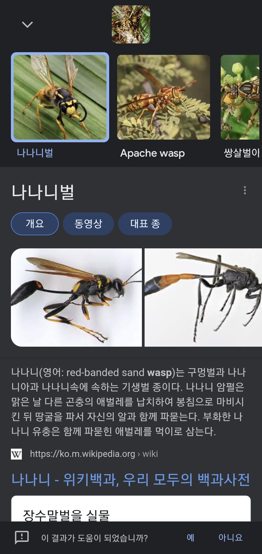 업로드한 곤충 사진에 대해 이 구글 렌즈는 "나나니벌"이라고 [아래 사진]과 같이 알려주네요. 이 곤충분야 전문가가 아니다 보니 알려주는 모든 것이 거의 처음 들어보는 이름입니다.