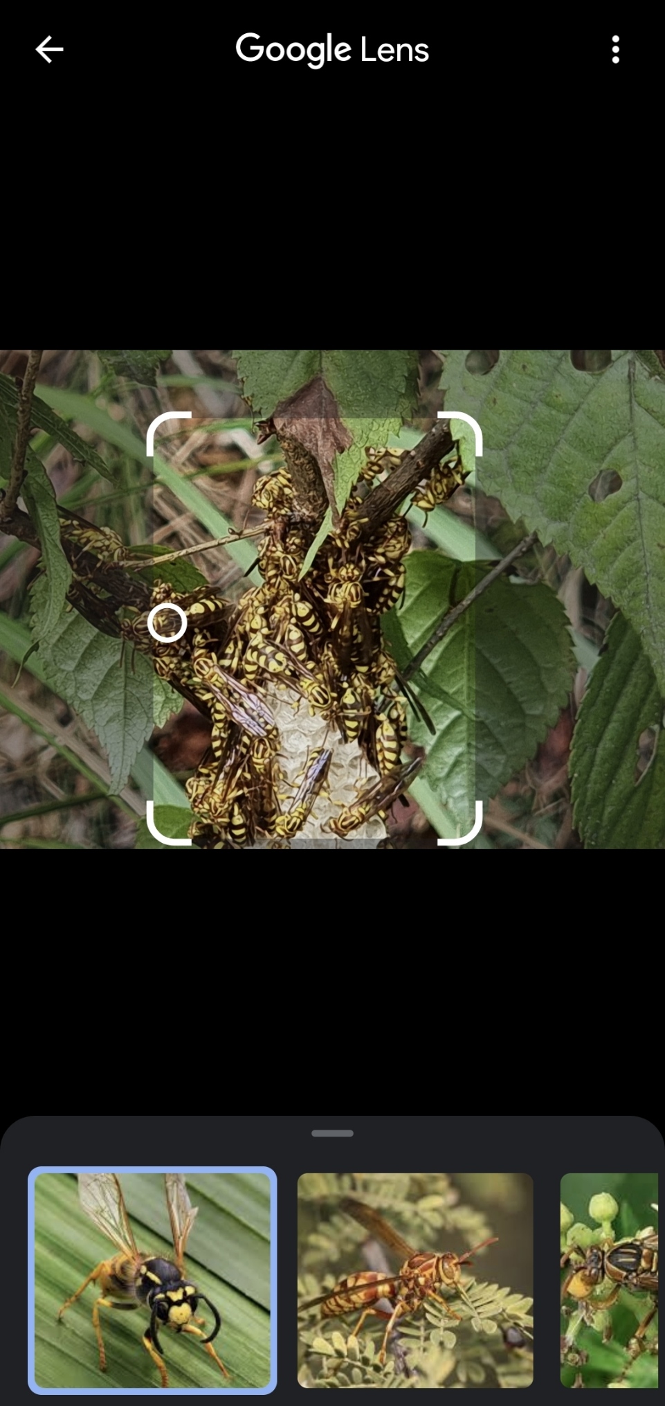 자세히 살펴보면 이 곤충 밑에 "벌집"같이 생긴 것이 보이는데 이것으로 보면 벌 종류로 추측은 가능했습니다.