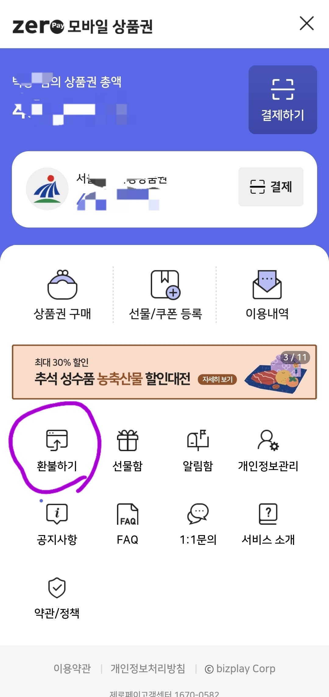 저는 최근에 처음 구입해 사용 중이기에 아직까지 환불은 해보지 않았습니다. 하지만 스마트폰 제로페이 모바일상품권 메뉴에 보니 "환불하기"가 있는 것은 확인했습니다.